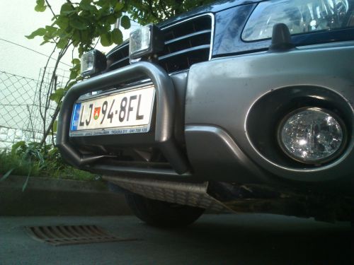 Od zgoraj naštetih stvari sem naredil poleg zaščito karterja še nudge bars-cevno zaščito z luči Hella micro FF. Cev je narejena iz cevi fi 48 mm in debelina stene 3 mm. Barvano z temeljno barvo olivno zeleno, osnovna barva je ista coda kot je odbijača in pa lakirano še z prozorno zaščito. Kolega mi je cev zakrivil barval sem sam. Barvanje mi ni šlo po maslu (zajeb...pištola za barvanje). Ko bo čas bom zbrusil in ga še enkrat barval. Dvig vozila in pa zaščito zad. diferenciala pride v roku enega meseca.