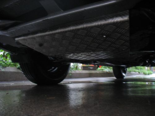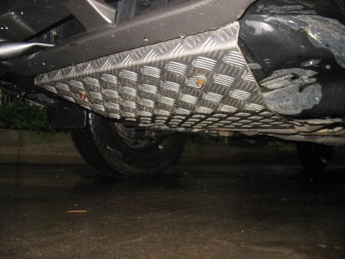Naredil bi ga pa tako, da bi bil privijačen na večih mestih - tam kjer je sedaj zaščitna plata(vezna stena), potem malo naprej, kjer je privit sedaj konec plate, ter še naprej do mosta za menjalnik. Na to pa bi potem zmontiral zaščitno plato - aluminij (pa gladek bi moral biti) čez celotno dolžino in širino - to pomeni od odbijača do mosta, ki drži menjalnik in od ene strani avta do druge po širini.
