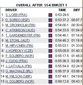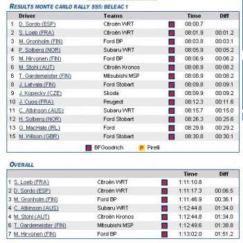 C4 so očitno dobro pretestirali in pripravili na podvige v novi sezoni. Loeba se je pozdravil (zlomljena roka na koncu prejšne sezone); Sordo je končno dobil priložnost in dober občutek... Daniju se verjetno kar smeje. Me zanima kakšne so finske kletvice (Gronholm); zaostanek "naših" ni katastrofalen... ga je pa že sedaj kar nekaj.